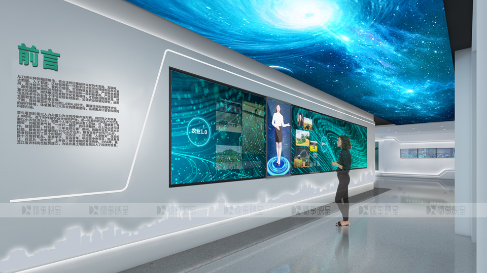滑動(dòng)屏形式,讓圖文“活”起來(lái),呈現(xiàn)農(nóng)業(yè)從原始到信息社會(huì)的進(jìn)階,配合宇宙星河的燈箱吊頂,呈現(xiàn)出人類對(duì)農(nóng)業(yè)不斷探索的精神。 | |